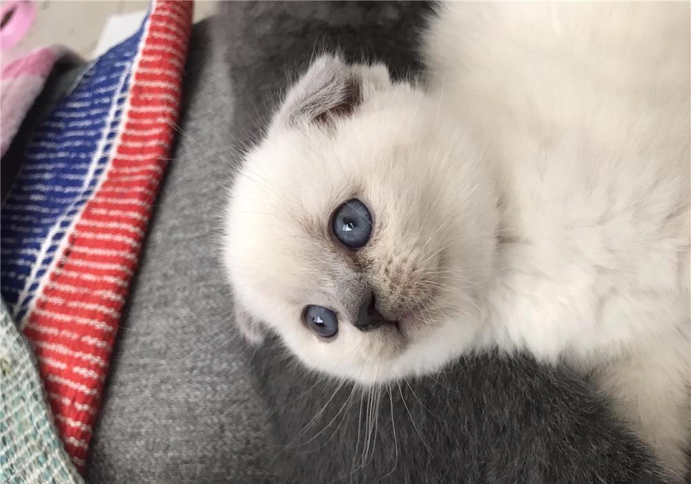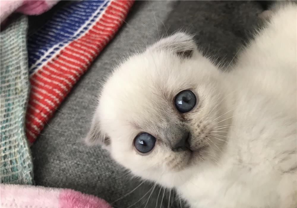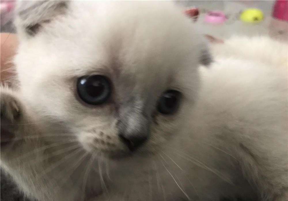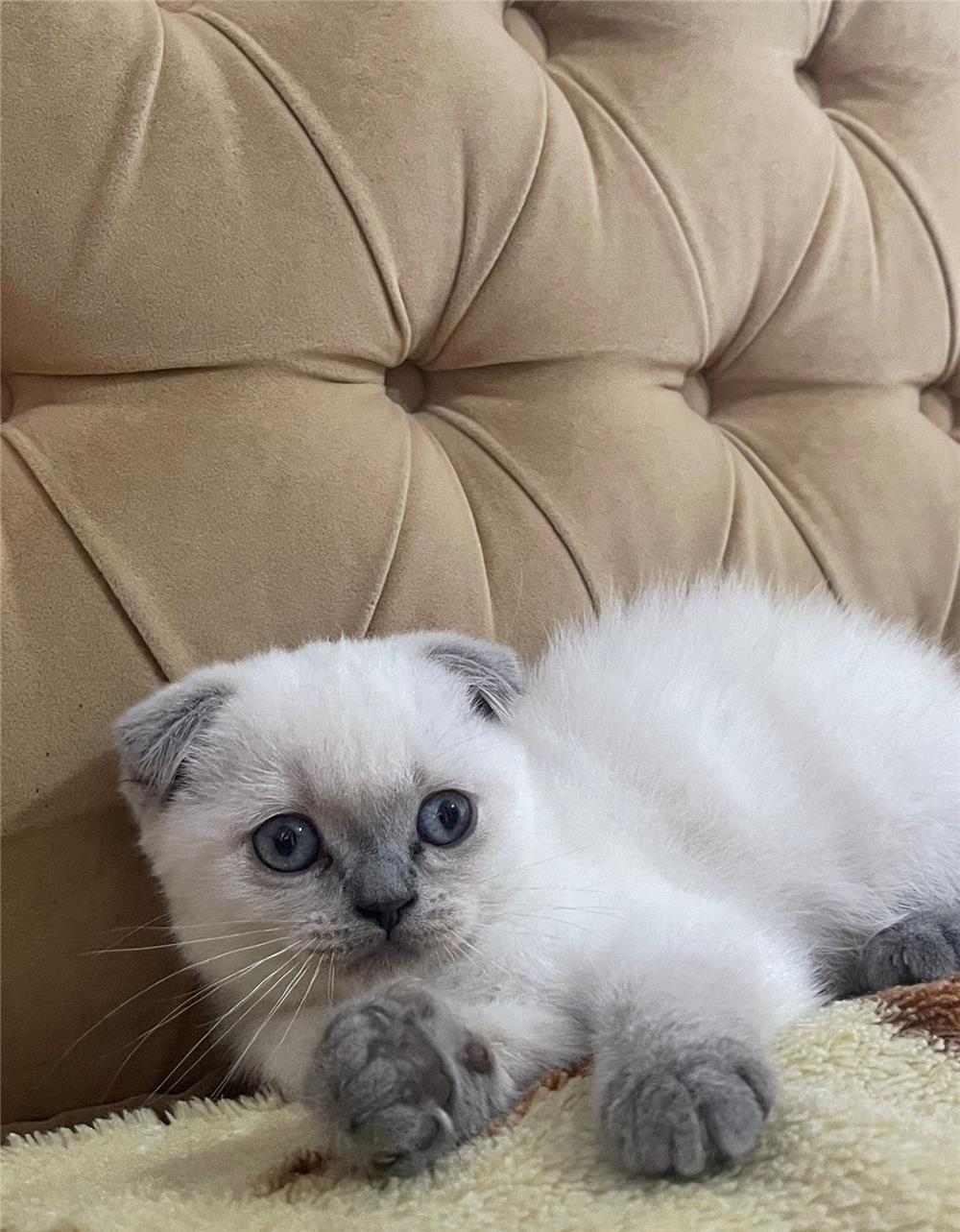 Pui de Scottish Fold Blue Point, femela, cu ochi albastri, exemplar rar, in varsta de 12 saptamani, autonom, invatat lalitiera, deparazitat intern/extern, vaccinat cu carnet de sanatate la zi, afectuos si jucaus.
