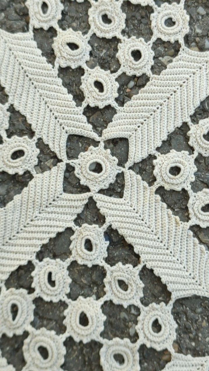 Aceasta față de masa a fost realizată cu ata specială pentru macrame si are o vechime considerabilă. O astfel de faţă de masa de marimea aceasta si o asemenea complexitate necesita multe zile de munca.