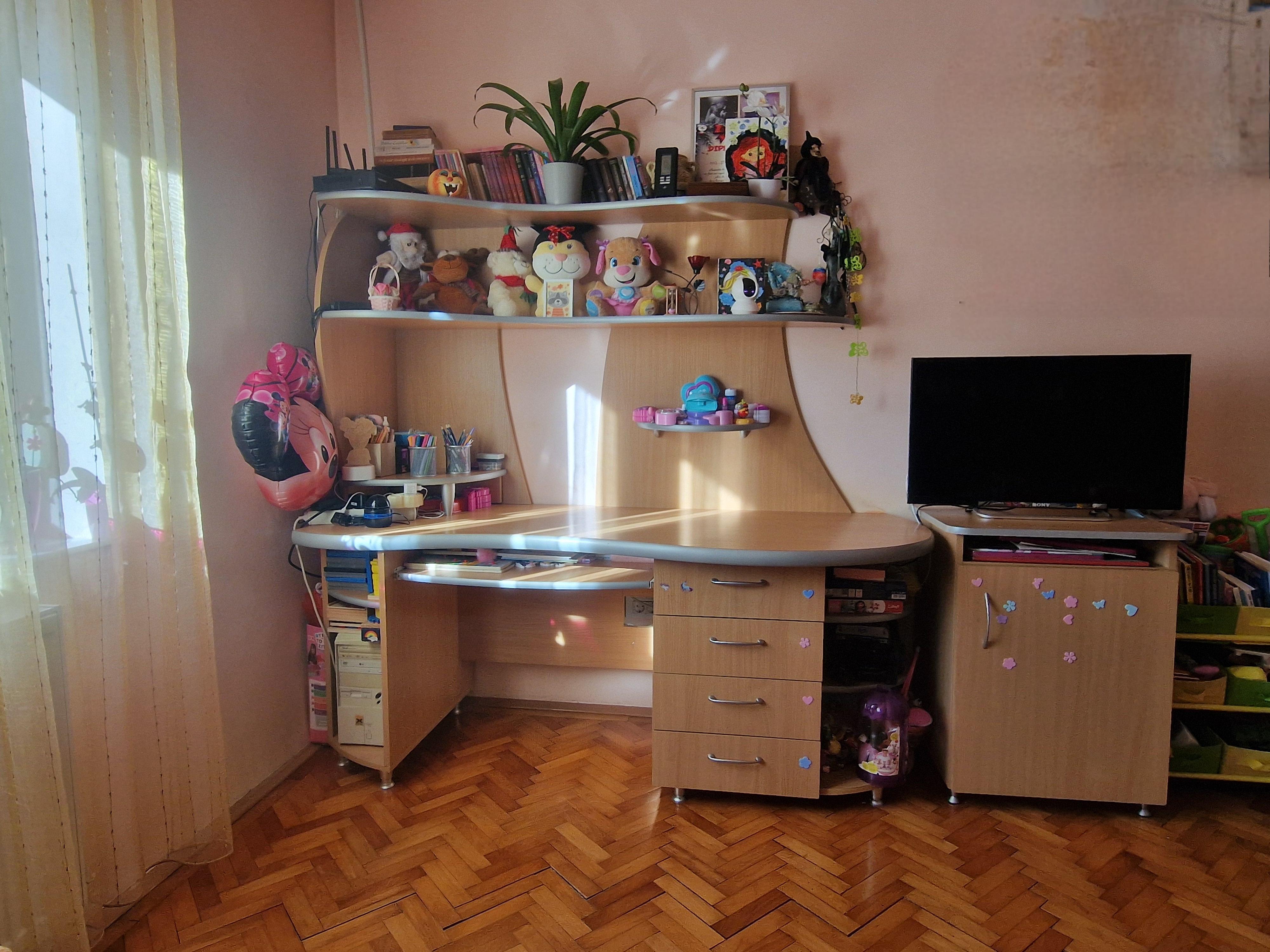 Vand mobilier tineret in stare foarte buna,compus din dulap cu 3 usi,220 cm inaltime,145 cm latime,corpuri suspendate 200 cm lungime,pat cu saltea 140/200 cm,cu sertare laterale pt.depozitare,birou 180 cm latime,comoda tv 60 cm latime,noptiera cu rotile 45 cm latime