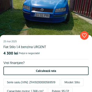 Vând mașină personala, proprietar în acte, fiat stilo, 2005, 1.4 16v benzina, 95 cp, cutie manuala 6 trepte. Mașina este în stare perfecta de funcționare. Are schimbul de ulei făcut recent, distribuția trebuie făcută iar lacul de pe capota s a exfoliat. Jante 16 anvelope aproape noi, de iarna. AC perfect funcțional. Servo-city. Inca un set de scaune de piele cu încălzire pentru interior. Alternator nou. Electromotor nou. Mașina este perfect functionala. ITP și asigurare valabile.