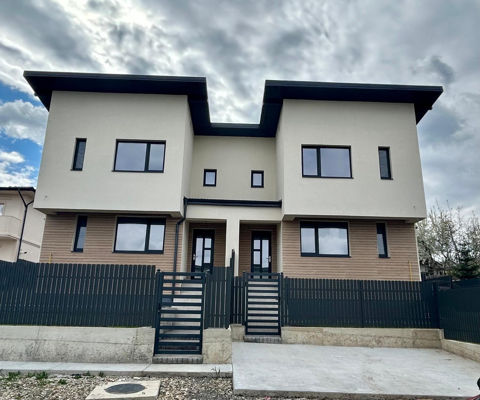 Exteriorul impresionează prin arhitectura modernă, ferestre mari și curte proprie, ideală pentru amenajare după propriul gust.