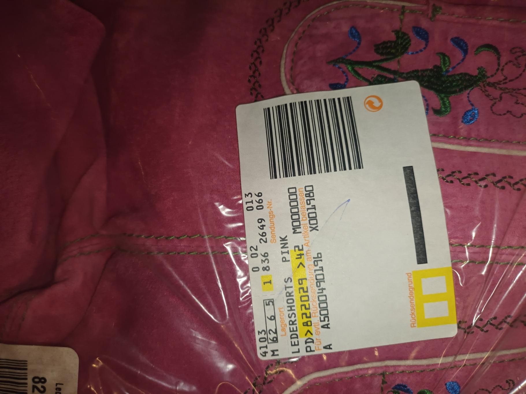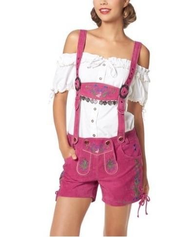 Pantaloni scurti din piele 100% cu motive traditionale. Culoare roz. Costum specific Oktoberfest. Broderie elaborata. Ornamente metalice si catarame tip retro.