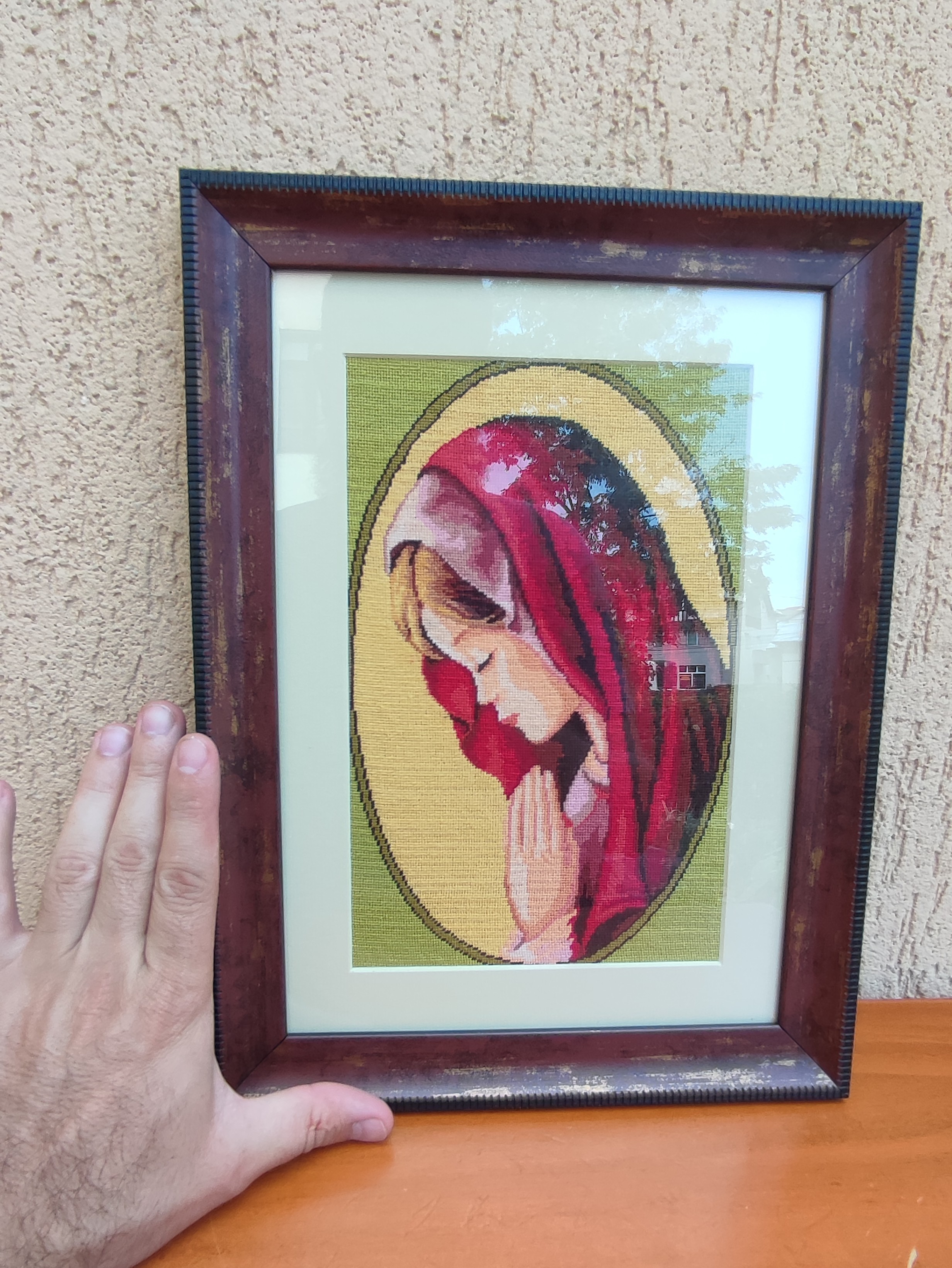 Vând goblen vintage cu pas mic confecționat artizanal, având ca model pe fecioara Maria rugându-se cu mâinile împreunate, acoperită de un vestmânt roșu. Goblenul este protejat de un geam de sticlă și are o frumoasă ramă din lemn decorata cu auriu.