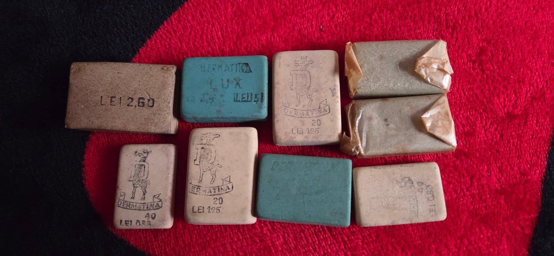 Vând un lot rar de gume de șters (radiere) originale, produse de fabrica Dermatina Timișoara în perioada comunistă. Sunt obiecte autentice de birotică românească, ideale pentru colecționari, decor retro sau recuzită de film/teatru.
