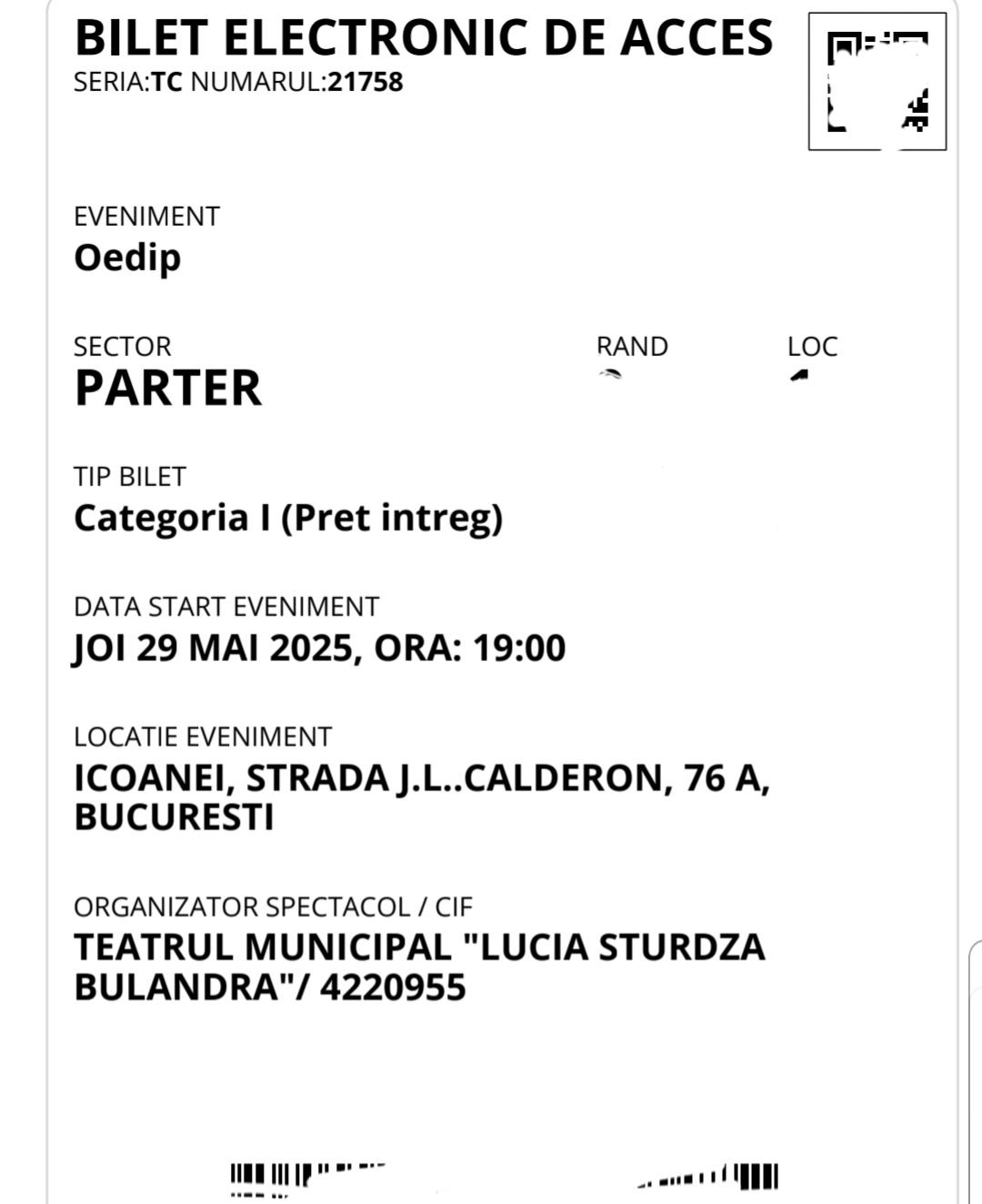 Vand 4 bilete la teatru Bulandra, sala Toma Caragiu, piesa OEDIP, pt joi 29.05.2025, ora 19:00