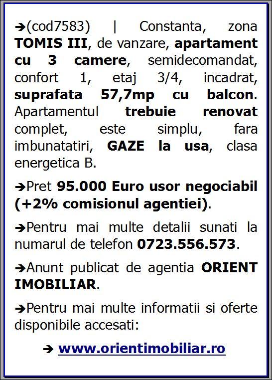 (cod7583) | Constanta, zona TOMIS III, de vanzare, apartament cu 3 camere, semidecomandat, confort 1, etaj 3/4, incadrat, suprafata 57,7mp cu balcon. Apartamentul trebuie renovat complet, este simplu, fara imbunatatiri, GAZE la usa, clasa energetica B.