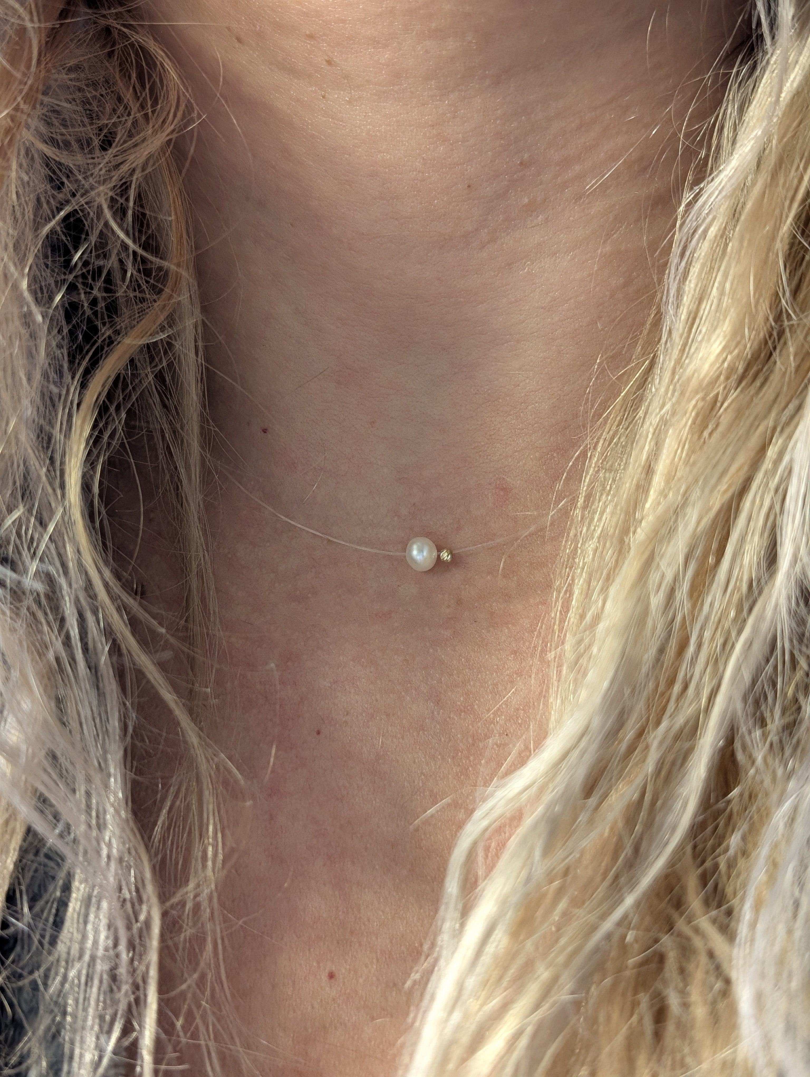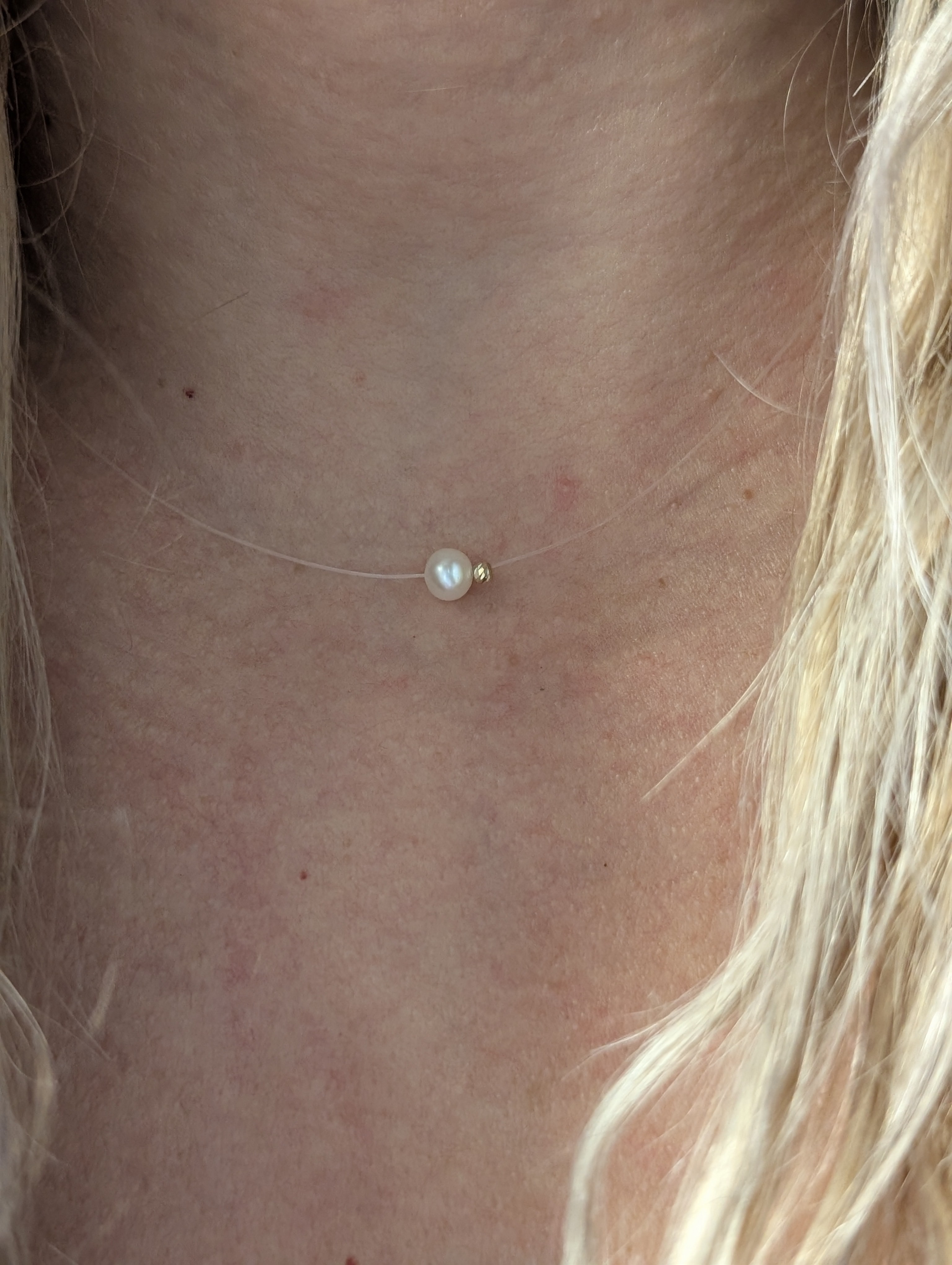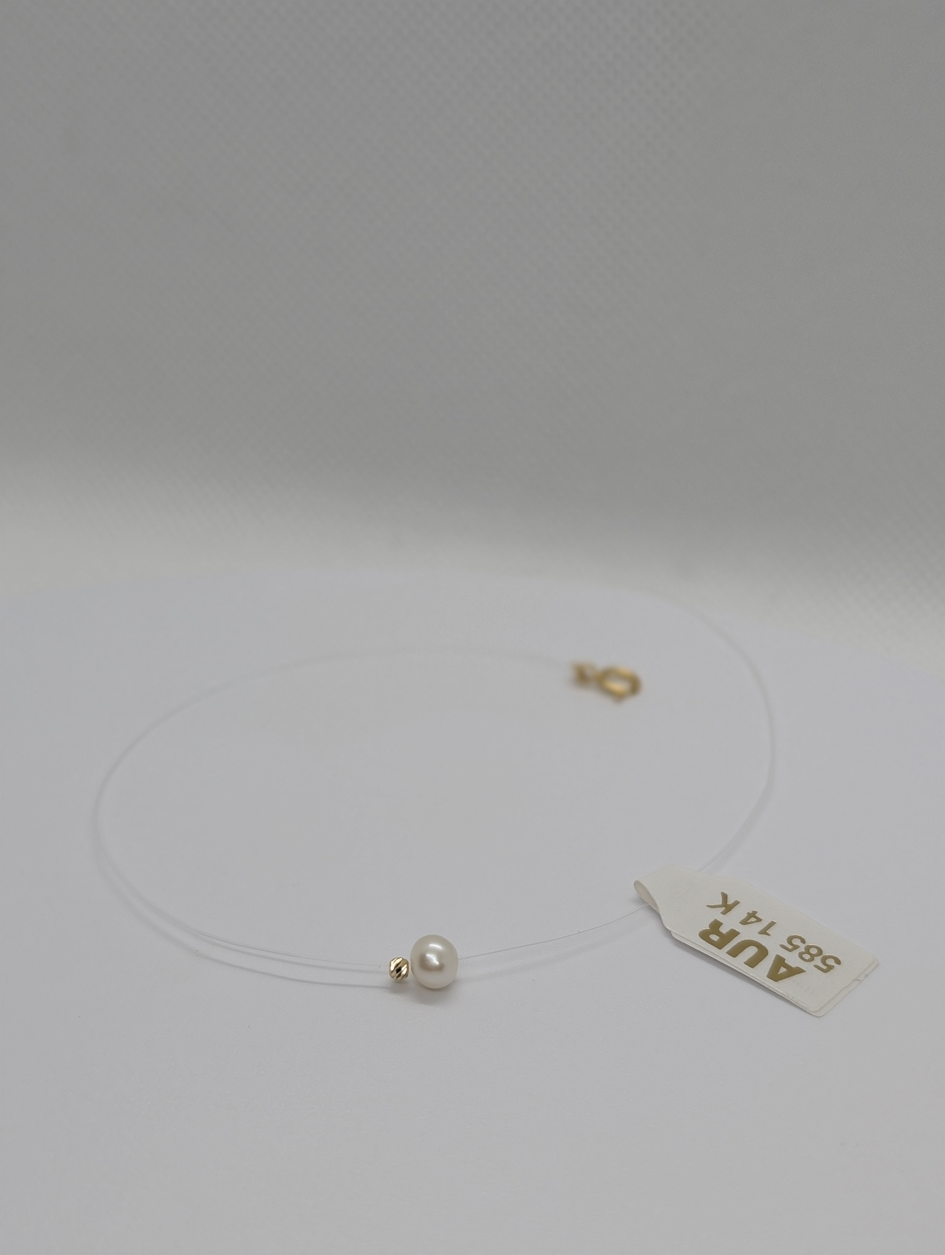 Colier pe fir transparent cu bila de aur 14k si perla de cultura. Lungimea se realizeaza la cerere. Sistemul de inchidere din argint.