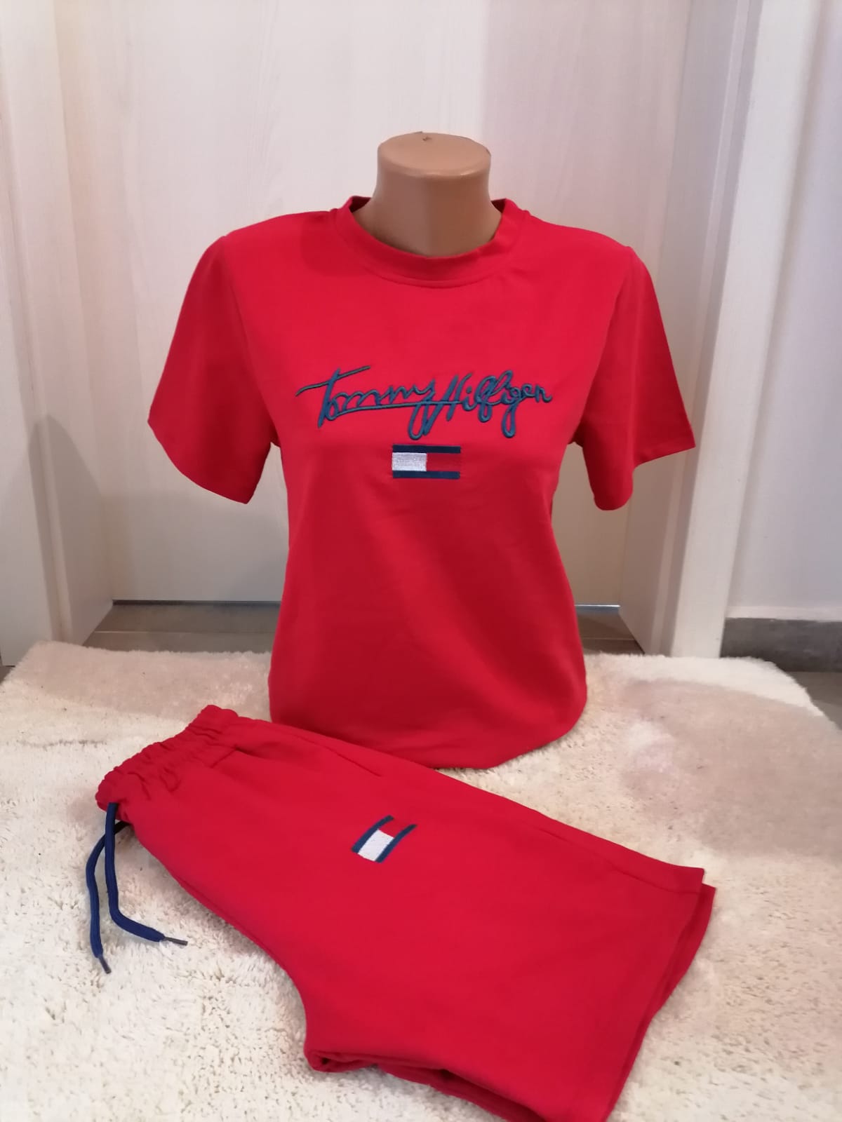 Vând set de damă format din tricou și pantaloni, ambele din bumbac de calitate. Tricoul are sigla cusută, oferind un aspect elegant și modern. Setul este disponibil în două culori: negru și roșu. Este ideal pentru purtare zilnică sau activități relaxante.
