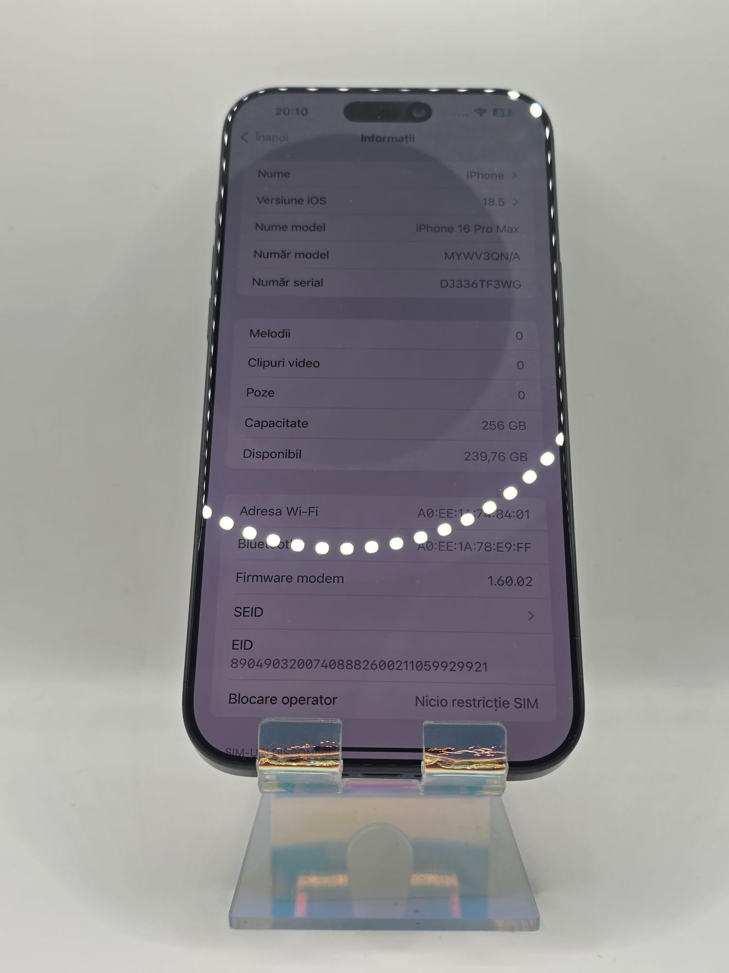 Iphone 16 Pro Max, MEM 256GB, RAM 8 GB, Black Titanium, Amanet Doamna Ghica, Cod: 94442