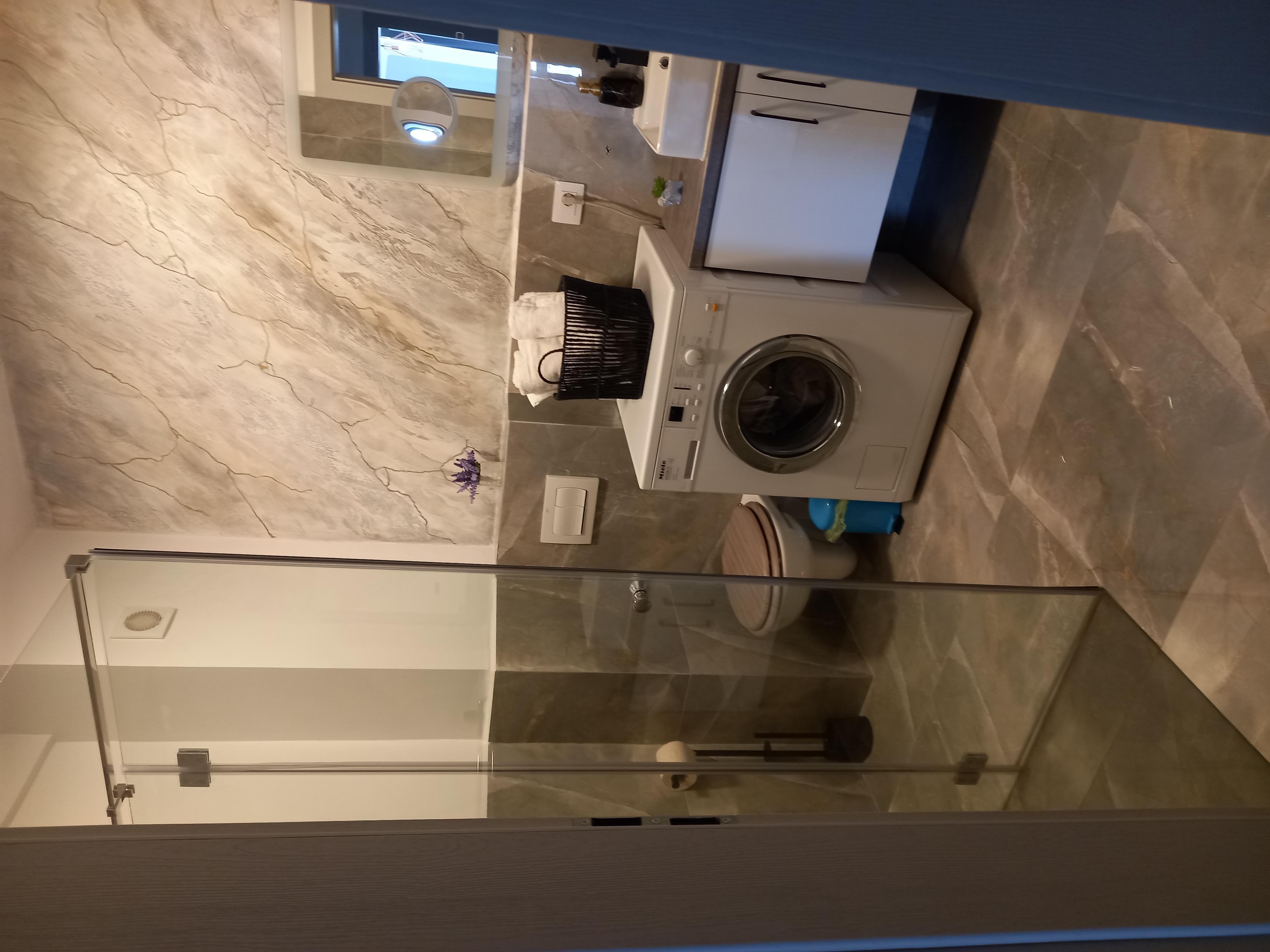 *baie cu cabina de dus si masina de spalat haine