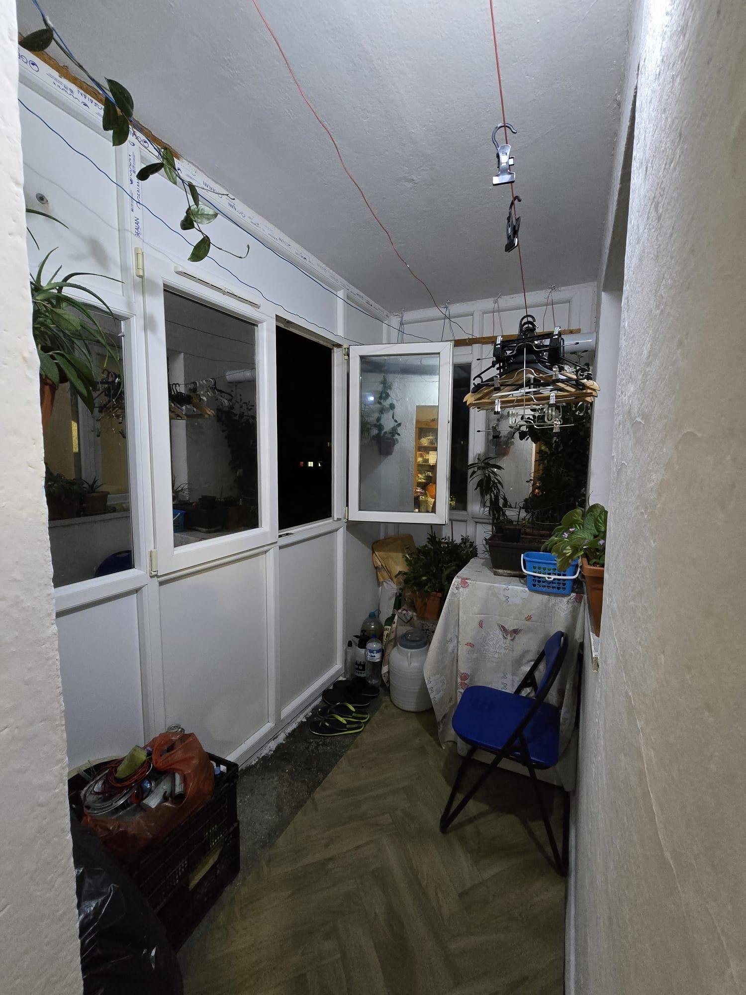 balcon inchis: masa mica cu scaun, ghivece flori, folie geamuri termopan tip oglinda,
