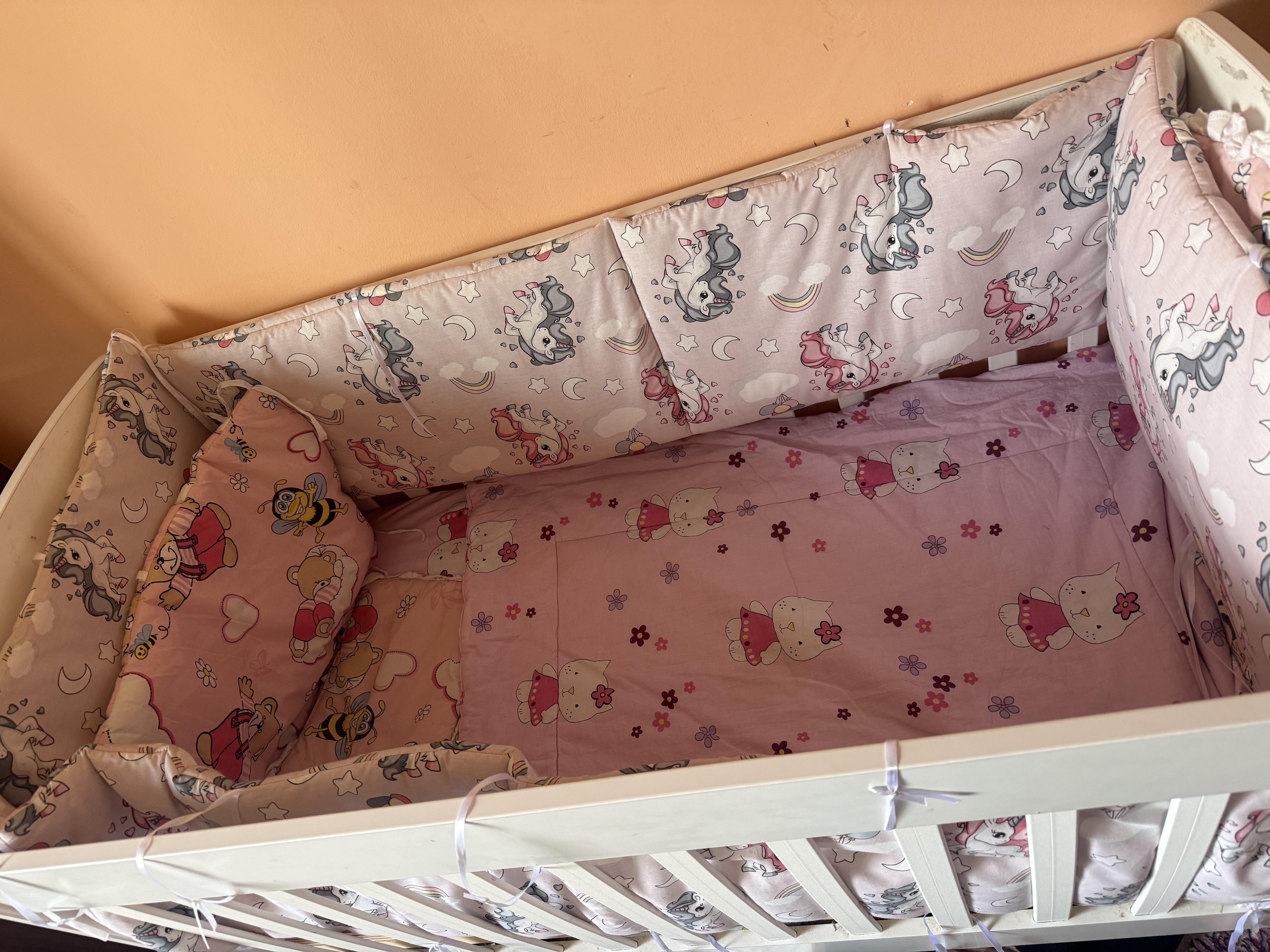 pătuț din lemn pentru bebe cu 3 im nivele cu saltea inclusă 120x60 + pernuță plăpumioară, set lenjerie huse pentru saltea , apărători pentru pătuț.