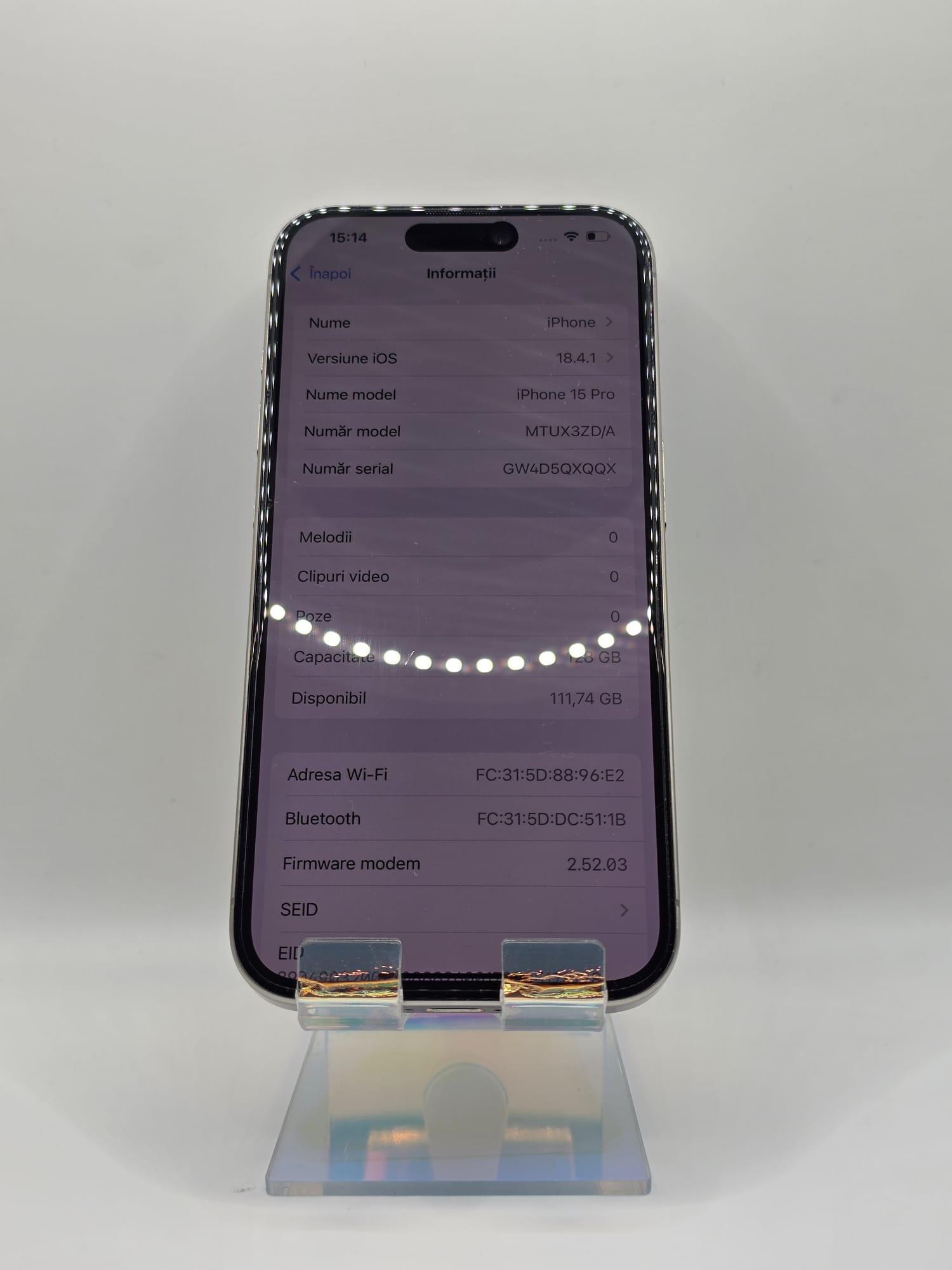Iphone 15 Pro, MEM 128GB, RAM 8GB, Natural Titanium, Amanet Doamna Ghica, Cod: 91560