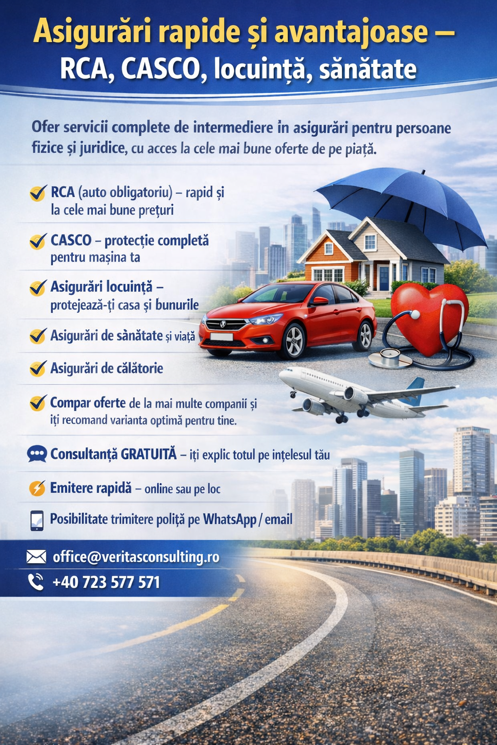 Ofer servicii complete de intermediere în asigurări pentru persoane fizice și juridice, cu acces la cele mai bune oferte de pe piață.