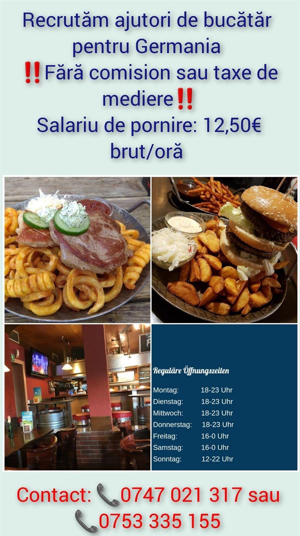 Ai mai lucrat in bucatarie si iti place sa gatesti? Daca poti conversa in limba germana si vrei sa castigi un salariu competitiv, e timpul sa lucrezi in Germania! Colaboratorul nostru german ofera cazare la doar 5 minute departare de punctul de lucru (restaurant), contract de munca fara comision pe termen nelimitat cu drepturi sociale depline si salariu motivant (pornind de la 12,50 brut/ora) + program de lucru bine structurat (46 ore de munca/saptamana). Alatura-te echipei si bucura-te de o munca bine facuta intr-un colectiv prietenos!