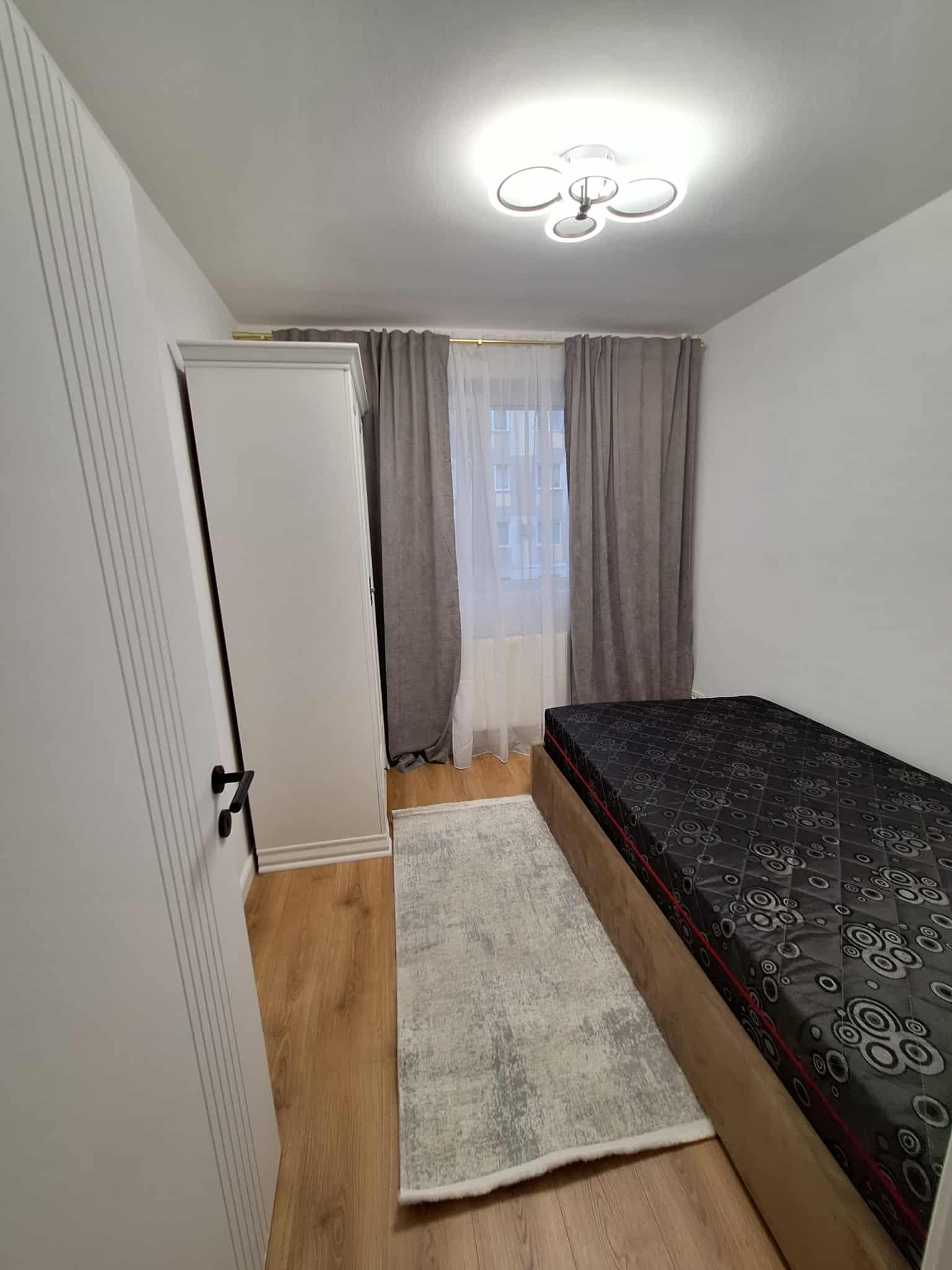 Apartamentul se află la etajul 2/4 și este compus din 2 dormitoare decomandate cu paturi tip dormitor, living+bucătărie open space, hol, o baie și o boxă la subsol. Este izolat termic la exterior, renovat recent, la prima închiriere, cu centrala proprie, mobilat modern, bucătărie echipată cu cuptor electric și plită pe gaz, frigider, mașină de spălat vase, mașină de spălat rufe cu uscător.