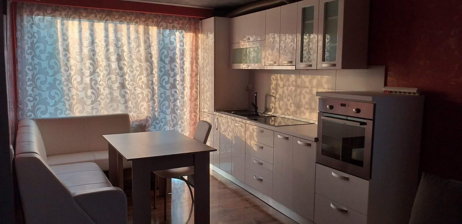 Utilat dupa cum urmeaza: masina de spalat rufe, frigider, centrala termica proprie cu termostat, plita si cuptor incorporat, hota, si mobilat dupa cum apare in poze.