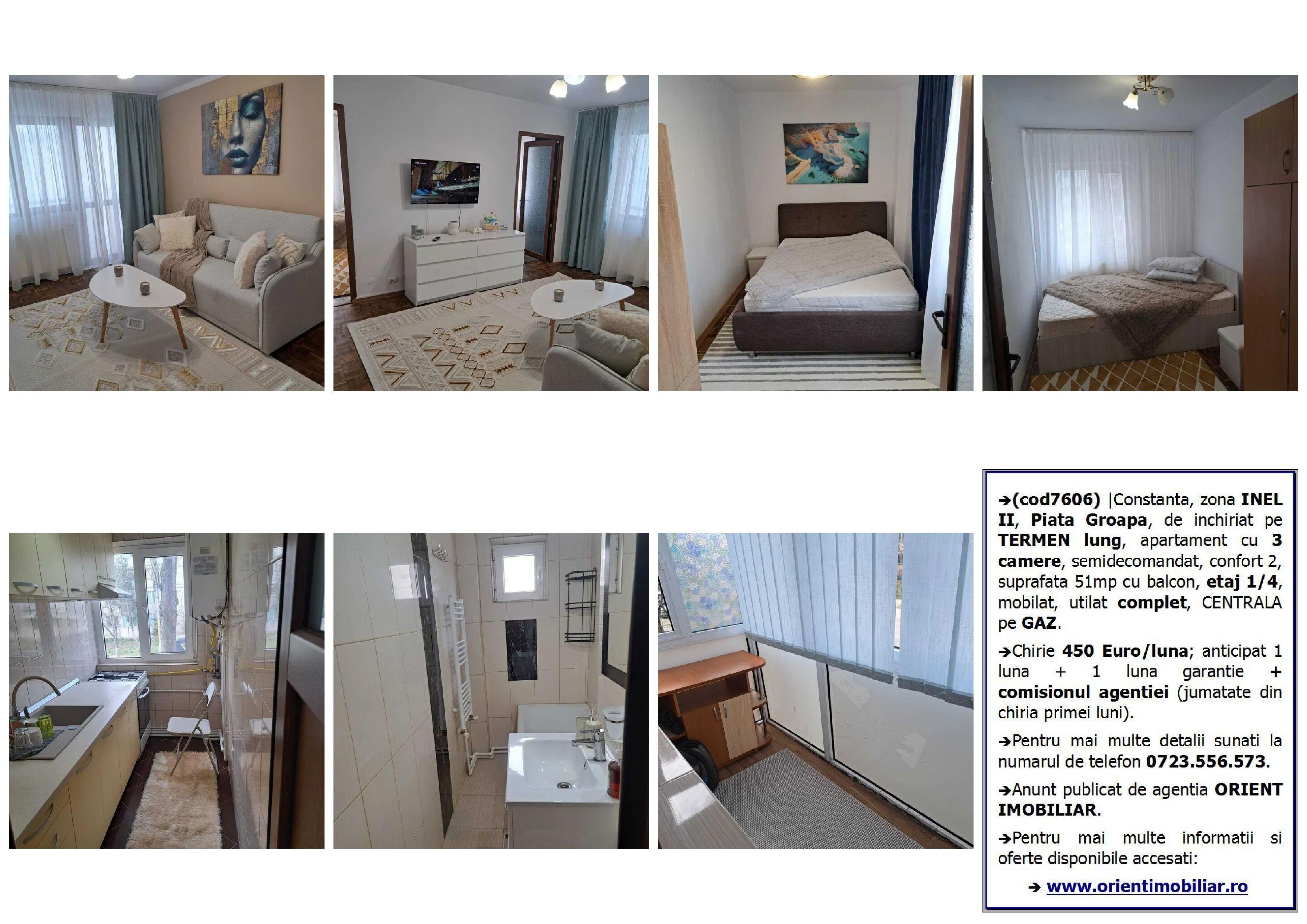 (cod7606) | Constanta, zona INEL II, Piata Groapa, de inchiriat pe TERMEN lung, apartament cu 3 camere, semidecomandat, confort 2, suprafata 51mp cu balcon, etaj 1/4, mobilat, utilat complet, CENTRALA pe GAZ.