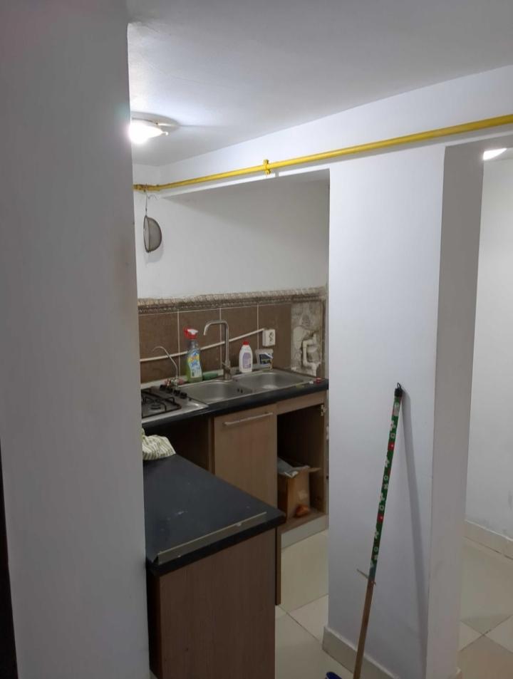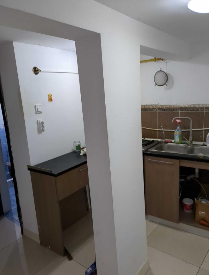 Bucătărie open cu spațiu pentru aragaz, frigider și chiuvetă