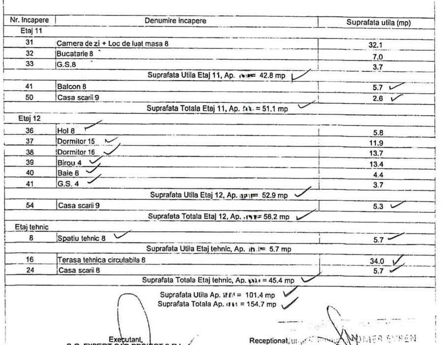 • Desfasurat pe ultimele 3 niveluri (11+12+ET), apartamentul are o suprafata utila totala de 154,70mp din care suprafata utila reprezinta 101,40mp.