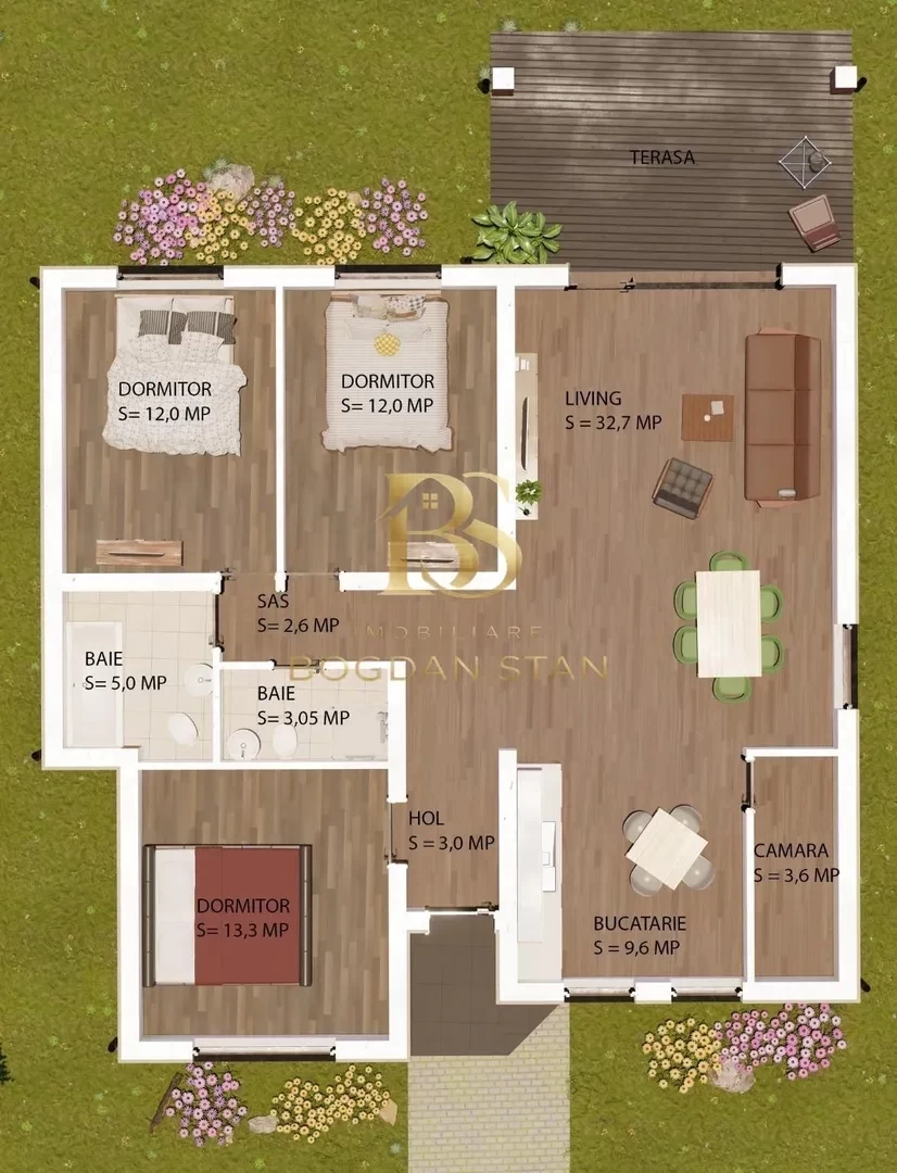 3 dormitoare, living cu bucătărie open space, 2 băi (una cu cadă și una cu duș), holuri, debara, terasă acoperită de aproximativ 10 mp și pod utilizabil.