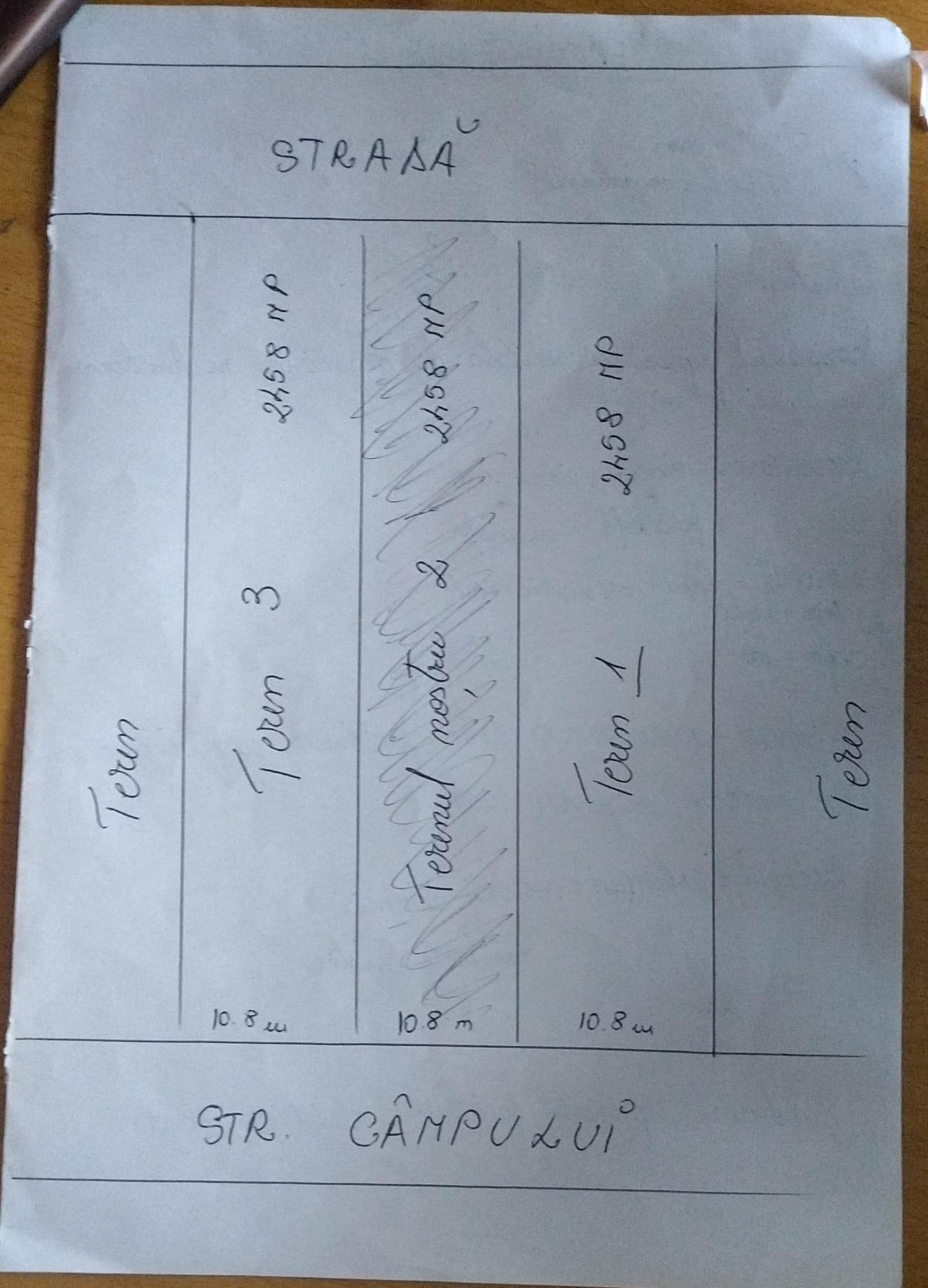 Fiecare teren în suprafata de 2458 mp, cu o deschidere de 10.8 ml si toate utilitatile se regasesc in apropiere : curent electric, apa si canalizare precum si gaze naturale. Terenul este pretabil pentru orice tip de constructie cu iesire pe doua strazi. Actele de cadastru si intabulare sunt in desfasurare , pretul fiind de 30 Euro/mp negociabil .